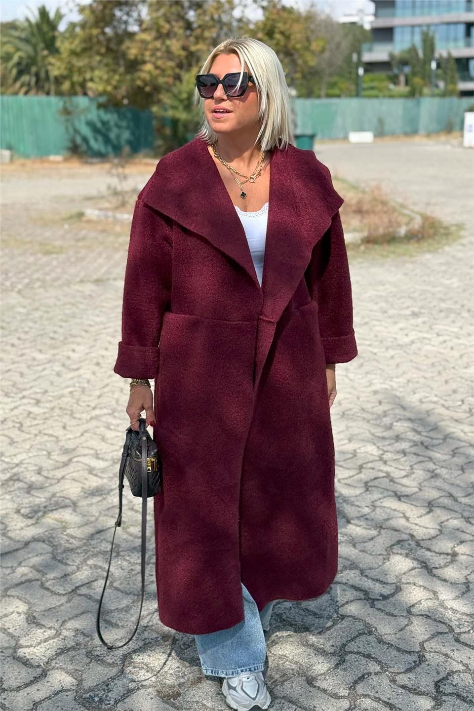Bordo Geniş Yakalı Cepli Uzun Keçe Ceket (ECKT2500134-BORDO-STD)