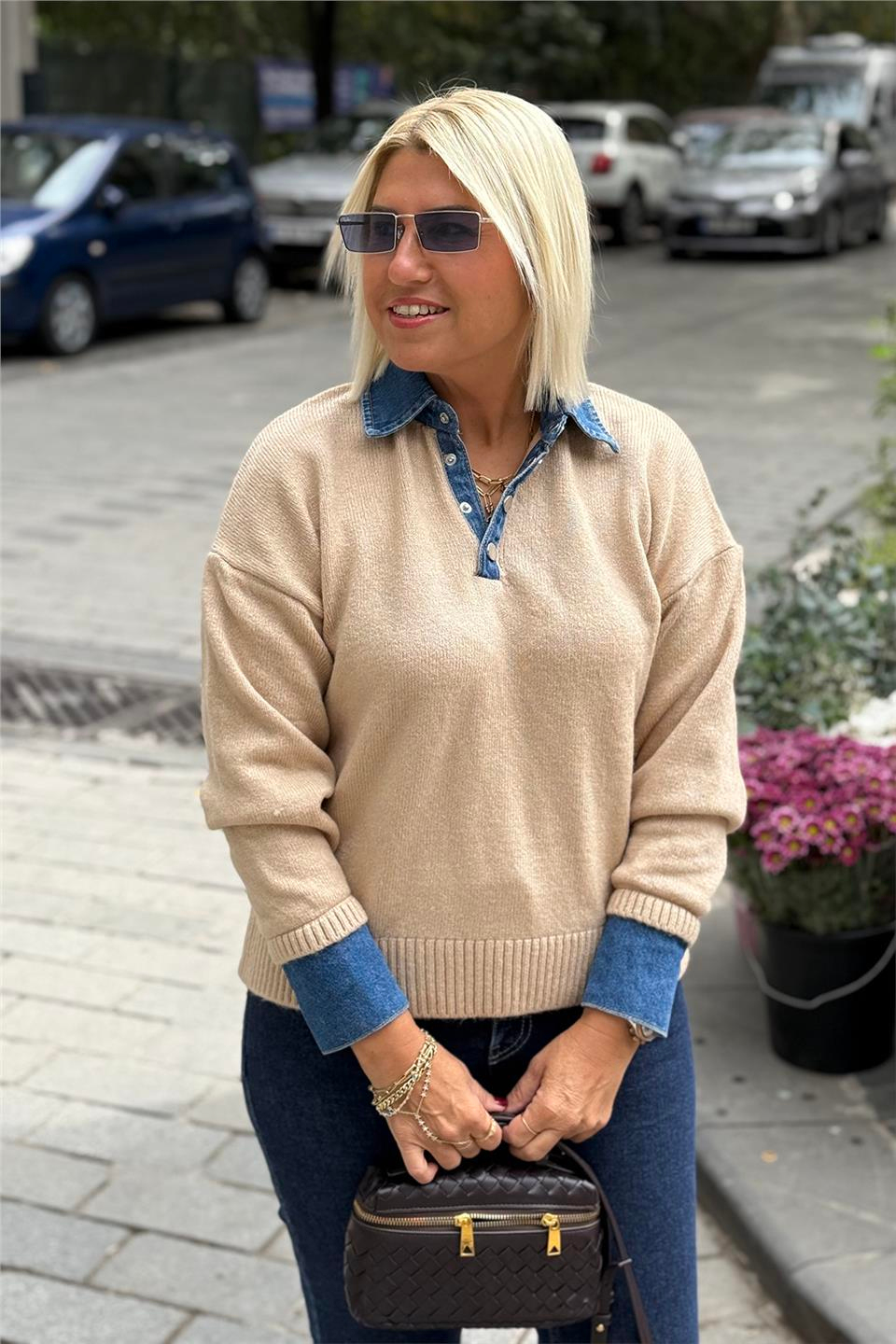 Camel Yaka ve Kol Denim Garnili Polo Yaka Kazak