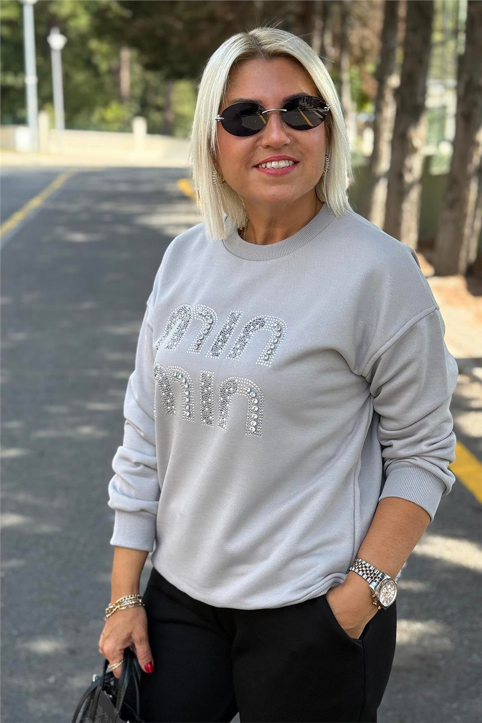 Gri Bisiklet Yaka Mın Taş İşlemeli Sweat