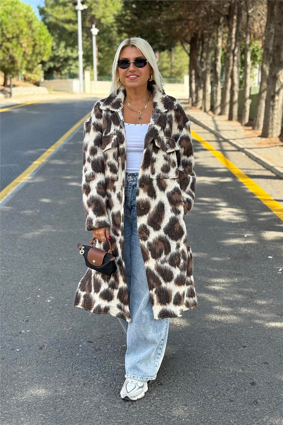 Kahverengi Desenli İthal Uzun Tüylü Ceket