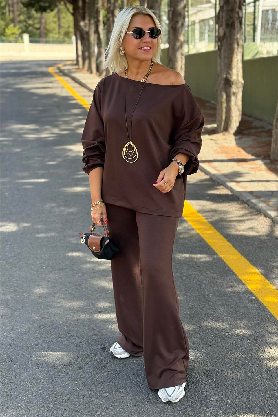 Kahverengi Düşük Omuz İspanyol Paça Modal Takım