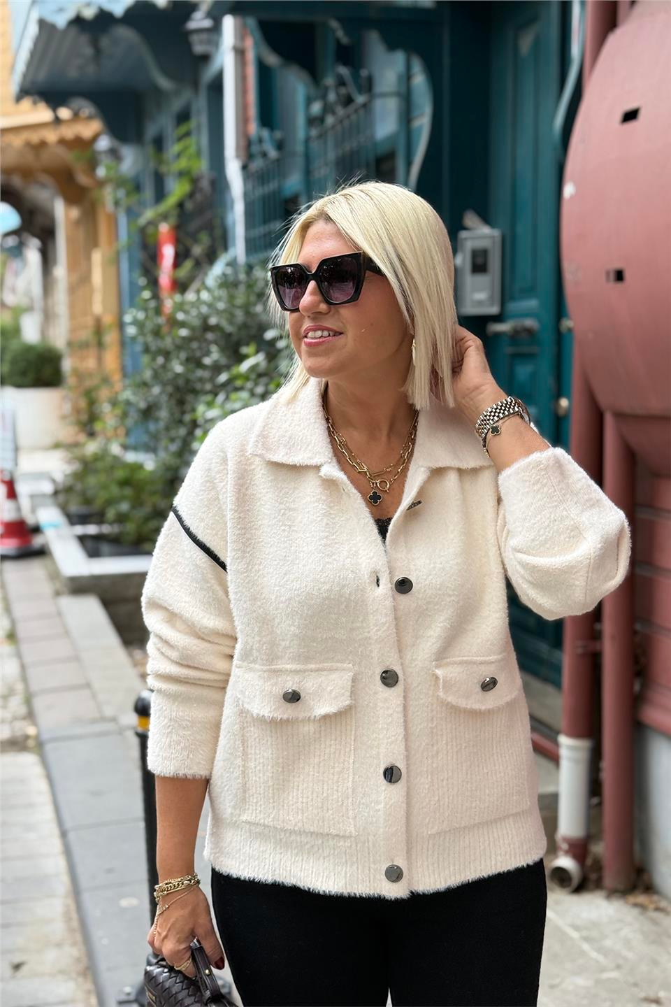 Kemik Renk Polo Yaka Kolları Biye Detaylı Cepli Angroa Hırka