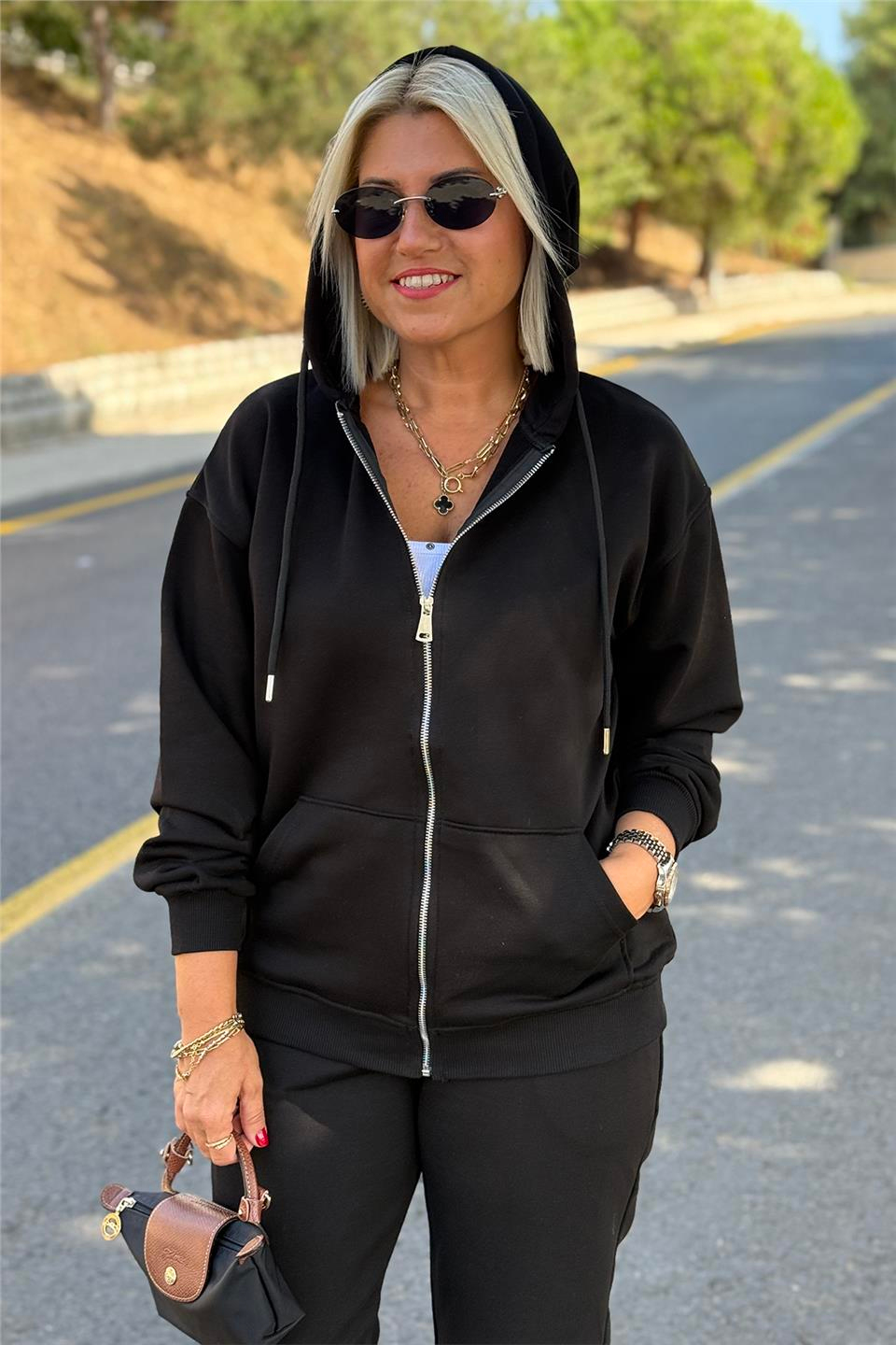 Siyah Fermuar Kapşonlu Üç İplik Sweat Hırka (DKH20250911-SIYAH-S)