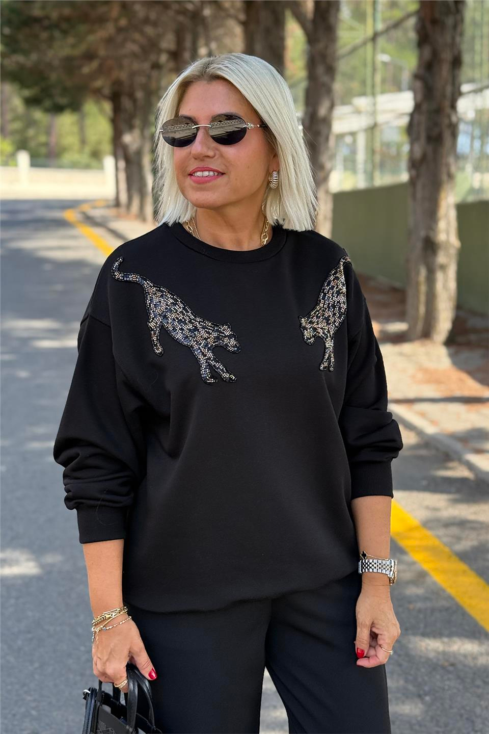 Siyah Omuzları Kaplan Nakışlı Sweat