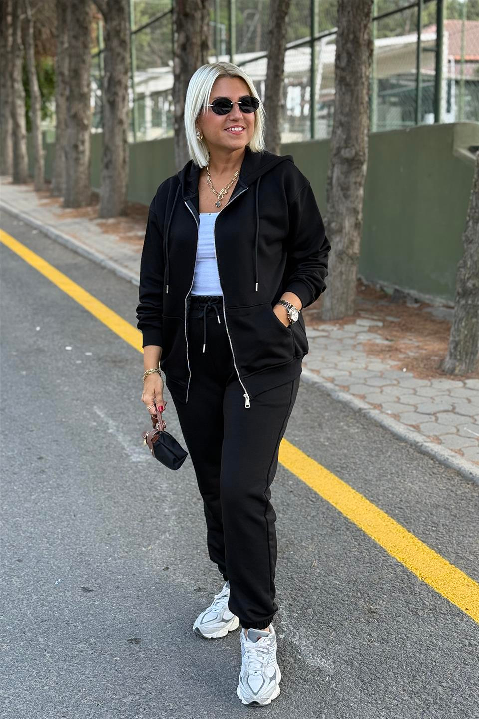 Siyah Paça Lastikli Cepli Üç İplik Eşofman Altı