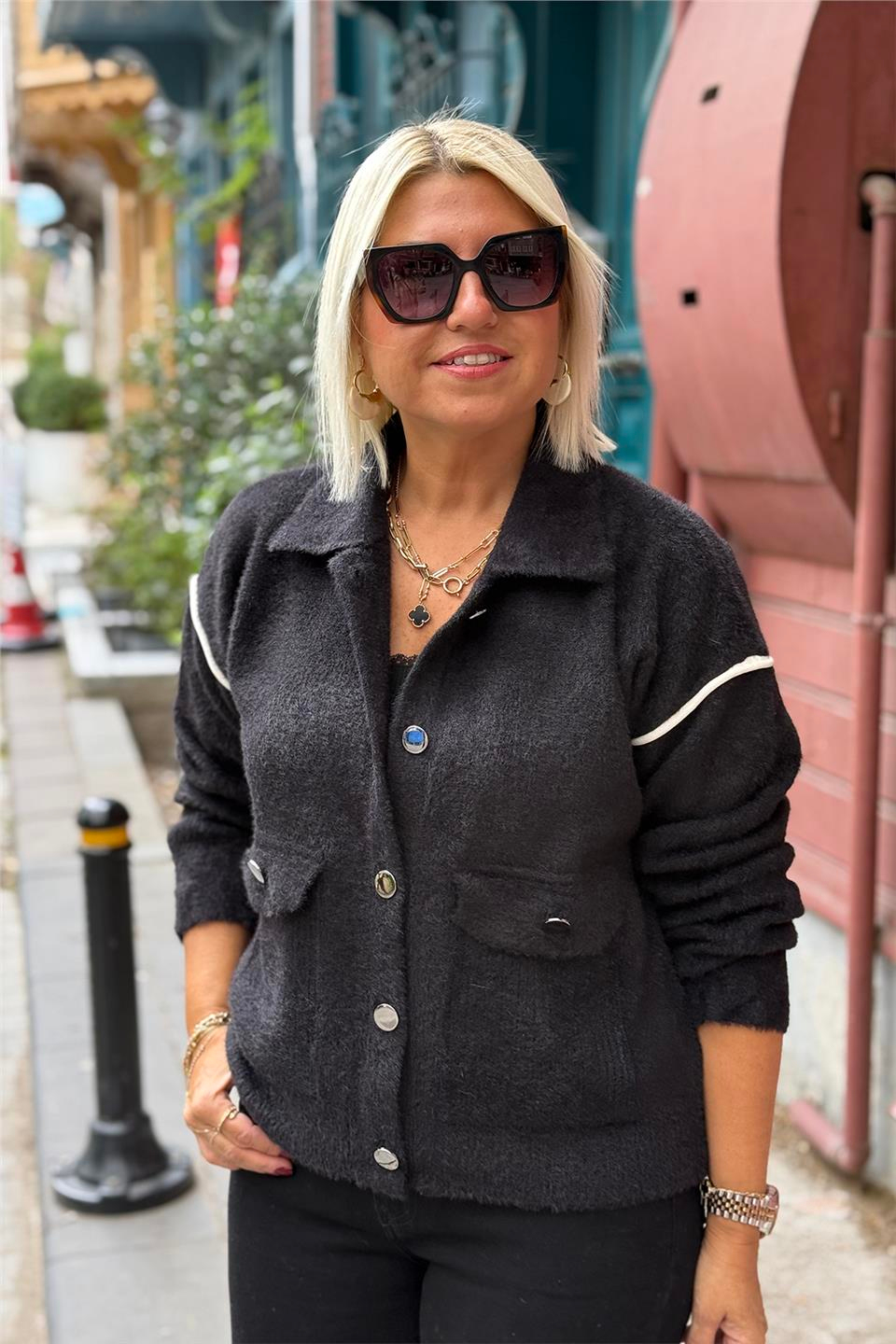 Siyah Polo Yaka Kolları Biye Detaylı Cepli Angroa Hırka