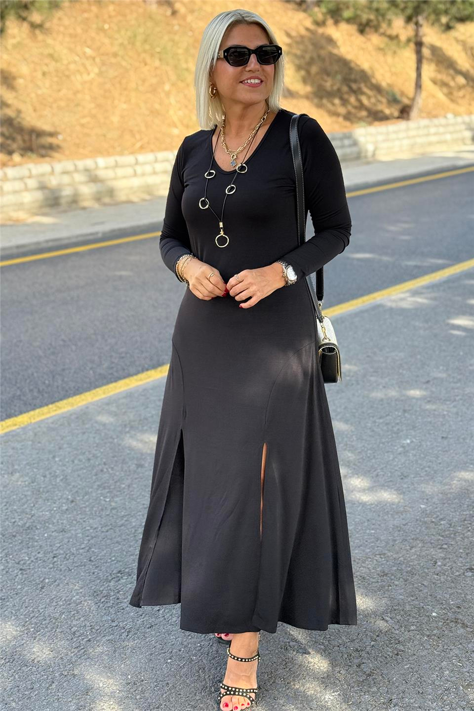 Siyah V Yaka Kolyeli Önden Yırtmaçlı Lycralı Elbise (ELB25013115-SIYAH-42)